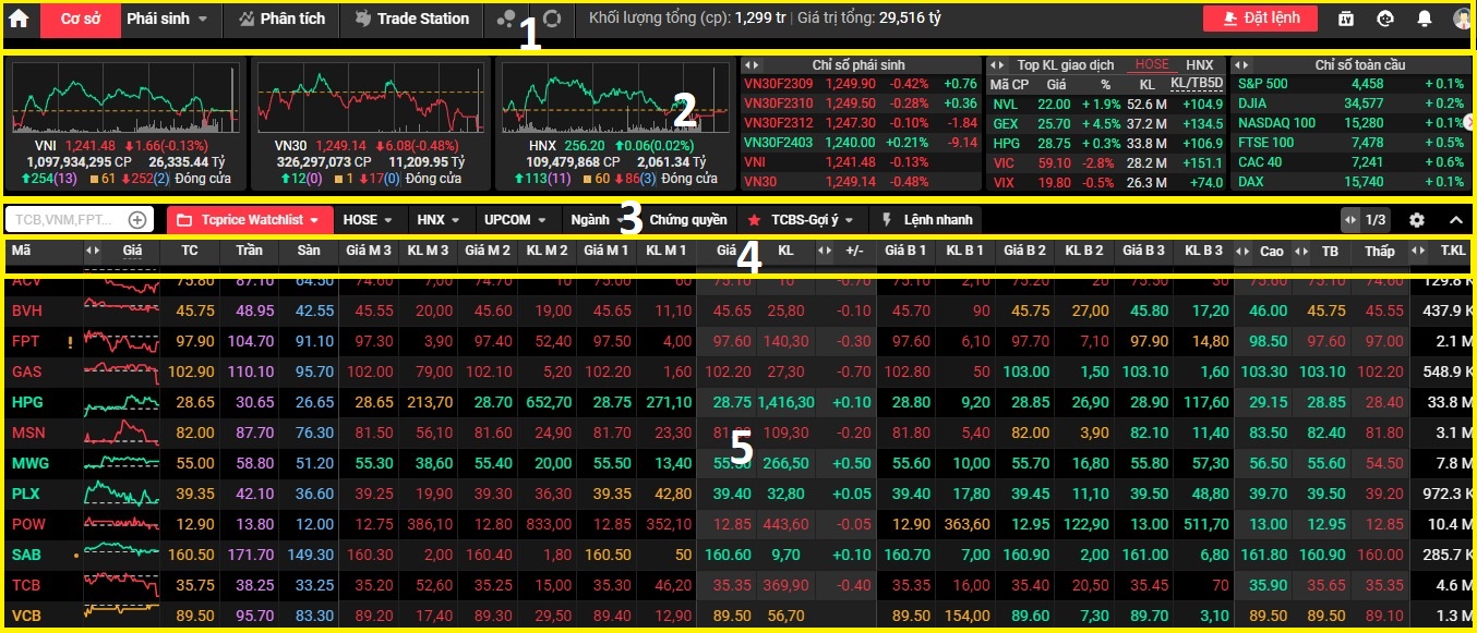 Sau đây chúng ta cùng tìm hiểu từng khung một từ trên xuống dưới của bảng giá chứng khoán TCBS nhé