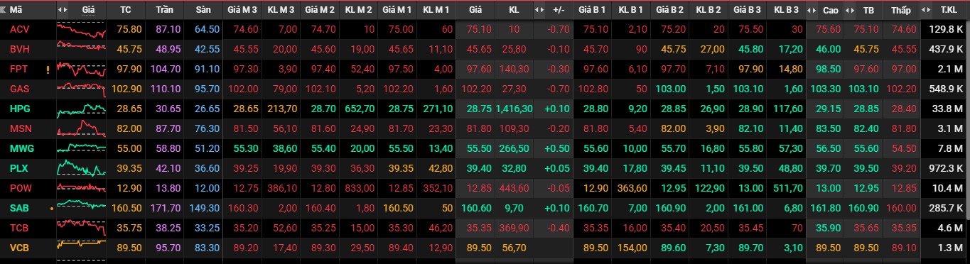 – +/-: là số điểm tăng hoặc % giảm cổ phiếu so với giá tham chiếu lúc đó