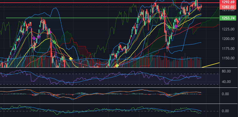 Xu hướng trong tuần qua chủ yếu đi ngang, sideway trong biên độ hẹp kể cả biên độ biến động và khối lượng, hình thành nên nến Doji thế hiện sự phân vân lưỡng lự của giới đầu tư. Ở đồ thị ngày, chỉ số VN-Index đóng phiên giao dịch cuối tuần trước với trạng thái giằng co giữa hai phe. Chỉ số hiện tại đang tạo ra vùng dao động biên độ từ 1.270-1.29x điểm với thanh khoản thấp, biến động phân hóa. Mặc dù lực cầu chủ động bắt đáy vẫn đang đóng vai trò hỗ trợ cho thị trường, áp lực cung phía trên vẫn còn tương đối lớn.