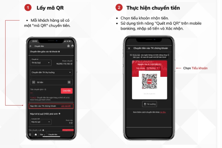 + Trên giao diên sau khi đăng nhập bạn vào mục Menu => chọn Tiền => chọn Chuyển tiền => kéo xuống phần Nộp tiền vào TK chứng khoán => chọn Nộp nhanh qua QR => Phần Tiểu khoản chọn TK Ký quỹ => Sau đó bạn đăng nhập vào app ngân hàng rồi dùng hình thức chuyển tiền quét mã QR code để quét mã trên, rồi tiến hành chuyển tiền như thông thường.